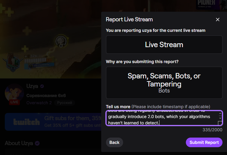 >>25868869 Его надо репорить так чтобы подходило под фейковые стримы. Где казик на ботов крутят всякие жопечи реперы маски и другие, у них еще названия рандомные буквы цифры. Что типо чел заводит и никто не пишет, стриминг чужих записей или феййк аккаунт.