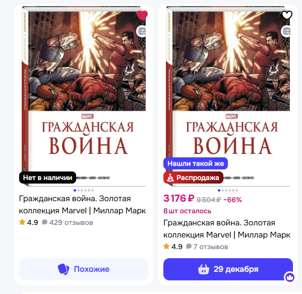 >>25869157 братан, марвел и диси ушли из россии в 2022 сейчас всё что продаётся это остатки старых тиражей вышедших до 2023, естественно с каждым днём их будет становиться меньше и цены будут увеличиваться так как издание становится редким дешевле точно нихуя не станет единственное что на авито многие распродают свои коллекции за копейки, там можешь и за 500 рублей урвать