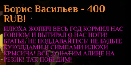 ИЛЬЯ ЖОПИЧ, ОБРАЩАЮСЬ К ВАМ ПУБЛИЧНО. ВЫ ОЧЕНЬ ЗРЯ ВЫЕБНУЛИСЬ НА НЯШУ АЛИНОЧКУ. УВИДИВ ВАШУ ГНИЛЬ, ВСЕ НАШЕ СООБЩЕСТВО КИСИКОВ СПЛОТИЛОСЬ ВОКРУГ АЛИНОЧКИ. ТЕПЕРЬ КИСИКИ СДЕЛАЮТ ВСЕ ЧТОБЫ ОБЕСПЕЧИТЬ ПОБЕДУ АЛИНОЧКИ В ИВЕНТЕ.