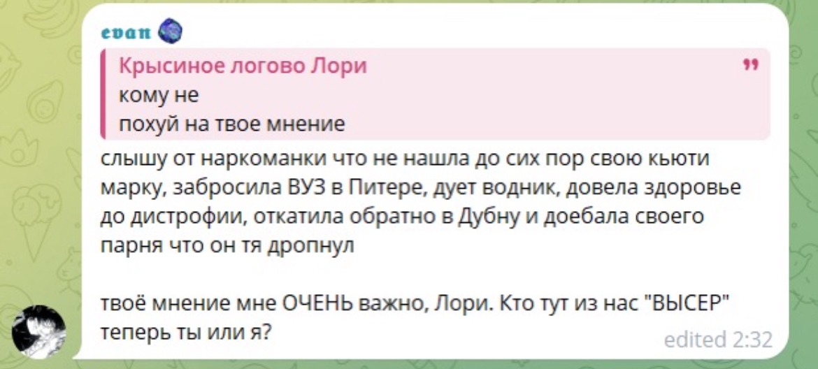 >>25877330 Кокидауна тыкает несколько человек, это просто забавно - заставлять его пыхтеть над пастами, которые особо никто не читает. Это как чату жпт написать "ты говнокод, написанный индусами за миску басмати" и смотреть, как он оправдывается. Кокихантер, я, нейротолчман - уже трое, с тобой четверо. Но ты тоже лукавишь, говоря, что тебе похуй - ты обидчивый и злопамятный. Всем отвергнувшим тебя стримершам ты мстил, колясу тоже нашел момент отомстить за оскорбления в группе, всё помнишь, кто про тебя что плохое говорил, как озон671, всё скринишь.