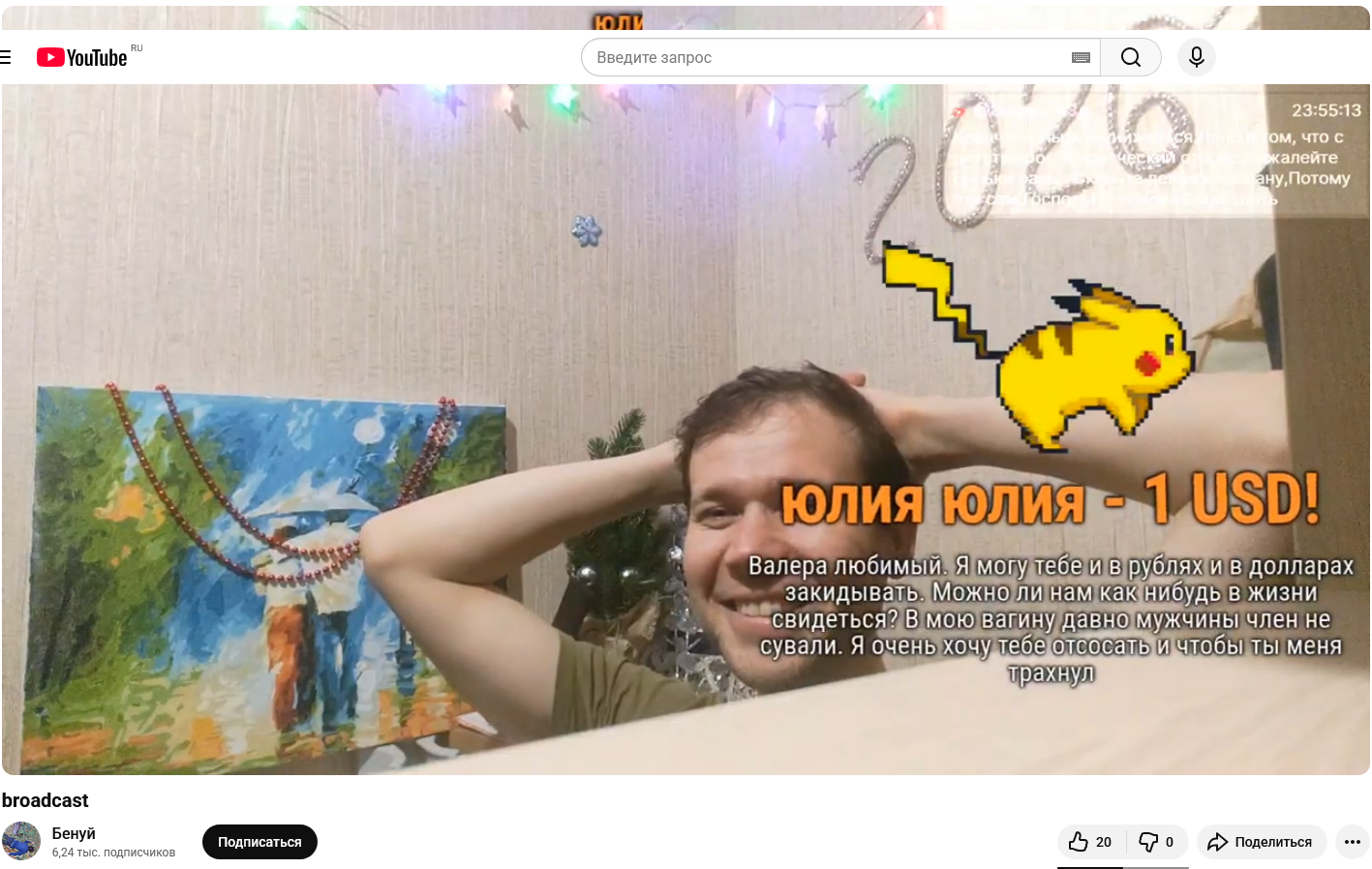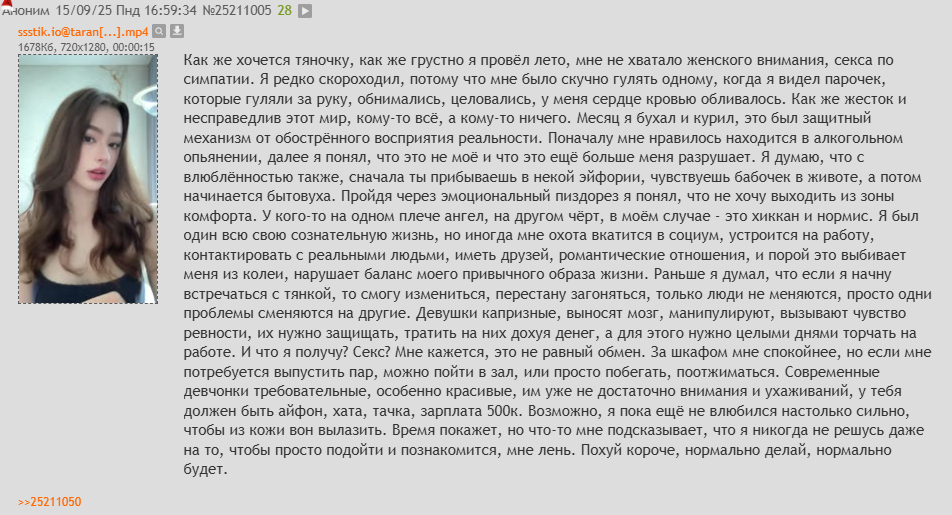 >>25888547 Обыкновенный бездельник. Бытовой инвалид. Образования нет, вечернюю школу еле-еле закончил. Жил в частном доме и целыми днями смотрел музыкальные клипы и фильмы, пока мама работала. Батя был алкашом и давно слился. Потом мать умерла, он завёл блог и начал ныть, что дом разваливается, хотя у него ещё однушка там же в Чебоксарах оказалась. Его самое популярное видево "ДЕВСТВЕННИК В 35", сейчас это уже не так. Ему писало много женщин. Одна тётя ему приглянулась, они общались, пока он работал охранником прошлой зимой, и она позвала его к себе, Бэн Хуй живёт у неё в квартире за её счёт и работать не планирует. Лутает донаты с мамонтов.