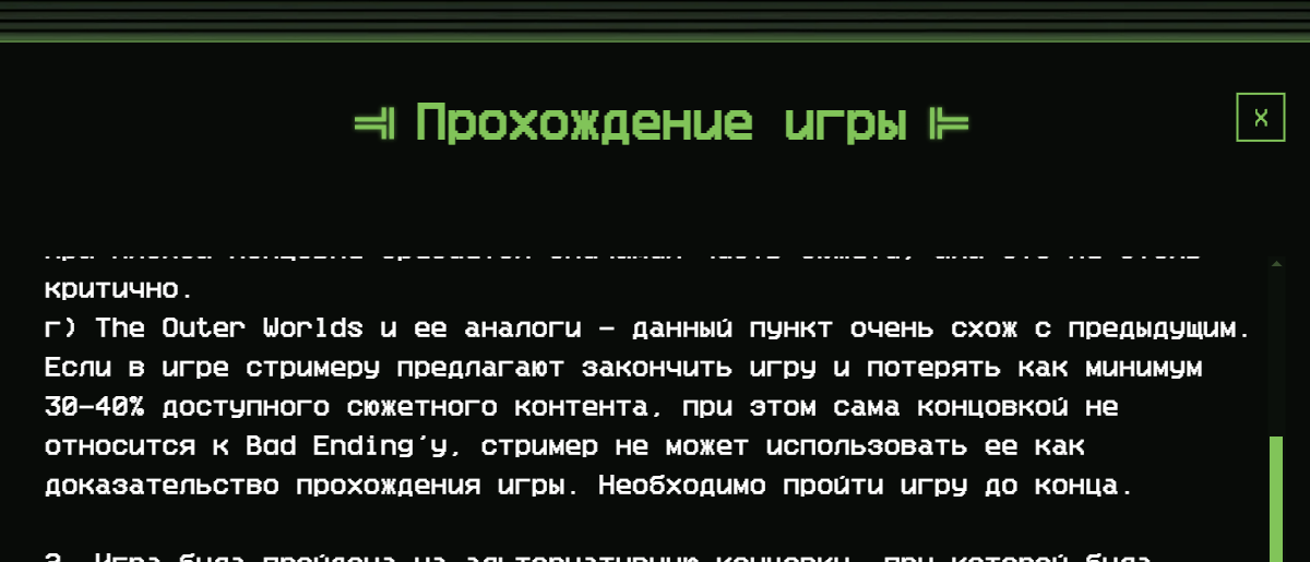 г) The Outer Worlds и ее аналоги - данный пункт очень схож с предыдущим. Если в игре стримеру предлагают закончить игру и потерять как минимум 30-40% доступного сюжетного контента, при этом сама концовкой не относится к Bad Ending’у, стример не может использовать ее как доказательство прохождения игры. Необходимо пройти игру до конца.
