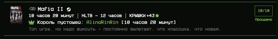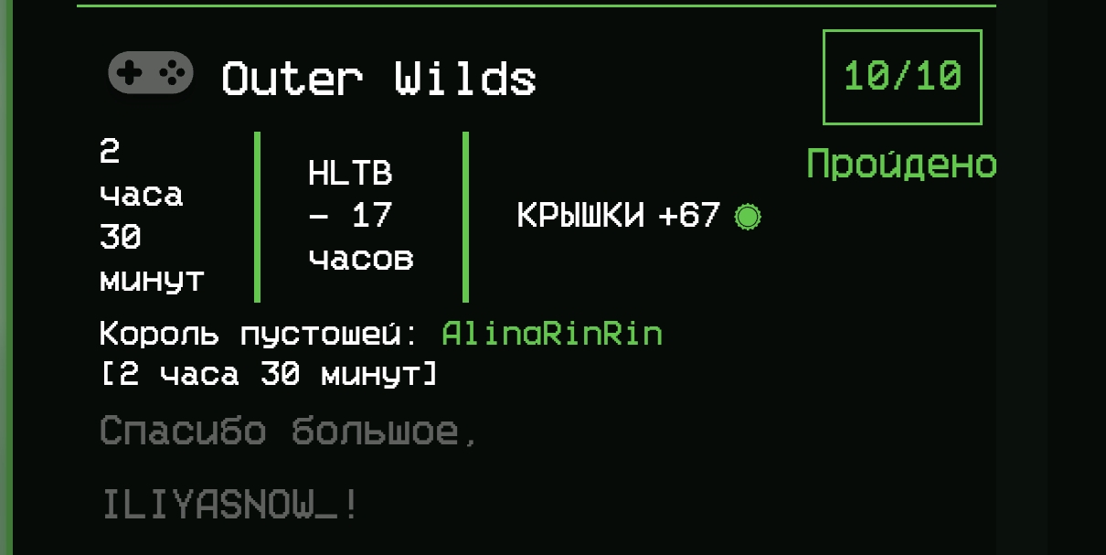Алина играла в Outer Wild, который по хлтб на 17 часов, и скипнула дохуя, и в правилах вот это >The Outer Worlds и ее аналоги - если в игре стримеру предлагают закончить игру и потерять как минимум 30-40% доступного сюжетного контента, при этом сама концовкой не относится к Bad Ending’у, стример не может использовать ее как доказательство прохождения игры. >Необходимо пройти игру до конца.