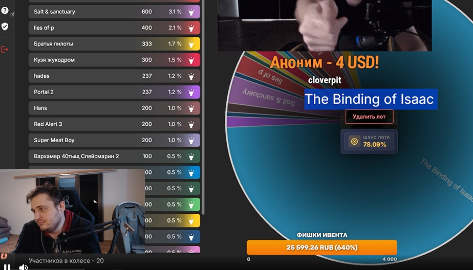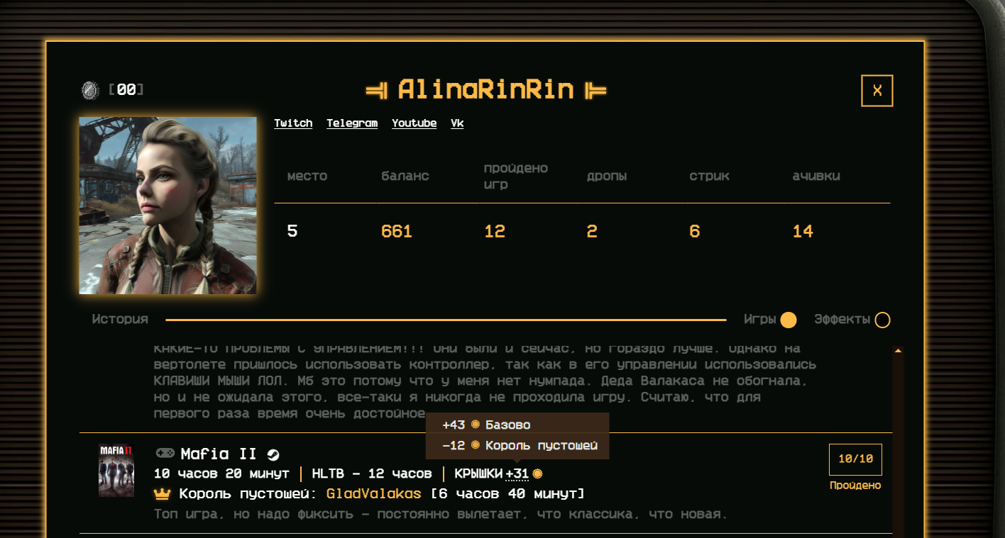 напомню для чего нужен СУДЬЯ: 1. Когда ты и сама, и хлтб проебываетесь, говоришь "время не то, я играла больше чем надо", СУДЬЯ просто с нихуя накидывает +25, а Валакасу за 40 часов ред алерта вместо 20 не накидывает. А мог бы просто сказать "сейчас ты прокрутишь все свои колеса, и я дам тебе 1-2 платиновые фишки для крутки, что бы эфферты не сгорели" 2. Когда ты сначала заставляешь проходить все кампании ред алерта, потому что они разные, а потом во властелине колец только за свет, потому что СУДЬЕ показалось что они одинаковые. Хотя они разные, я и в детстве играл, в этом году на стриме прохождение смотрел. 3. Когда СУДЬЯ говорит что психологический хорор на рпг мейкере это не хорор, потому что не страшно. Но при этом на другом ивенте СУДЬИ в жанре "хорор" выпадает рыбка фреди, потому что в тегах стима есть "хорор" это легетимная игра. 4. Когда СУДЬЯ сначала говорит что диспатч это отдаленно стратегия, но потом не стратегия. 5. Когда СУДЬЯ говорит что нужно пройти цикл в рогалике, но потом все таки не цикл, а так полигры. 6. Когда участник ивента начинает мошнить на другого, СУДЬЯ вместо того, что бы нормально разрешить ситуацию забивает хуй. Мог бы просто сказать "Алина, стратегия у Валакаса старый кал, мы её пытаемся запустить 30 минут, если нет то рерол. Если запускается, и постоянно крашится или мышка из игры улетает, то тоже рерол" 7. СУДЬЯ нужен что бы заставить Валакаса играть в игру, у которой нет времени на хлтб (только на все ачивки 1 оценка). И плевать, что весь ивент строится на времени с хлтб, в этот раз мы будем начислять крышки по фактическому времени, а снимать при дропе по сайту, то есть 1 крышку. А реролить нет нет нет.