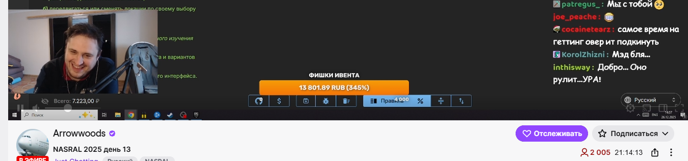 на секундочку, это последний день аукциона. медиатруп в виде валакаса поймал просто огромный темп, его уже вторую неделю смотрят 2-3к, он даже в вк стрим перестал включать. каблук алинырин 400-500к закинул на один день другим стримерам, чтобы обезопасить свою королевну. зрители чмодья до сих пор слепо преданы, жиржаржур или как ту малютку звали ночью сидела с кумиром детства, чтобы (не)смеяться над шутками короля. и все это ради того, чтобы стример не целовал пипиську. ну, а на скрине аравудус.