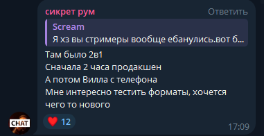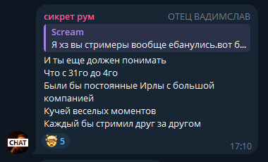я ток с двачей узнаю, что у топ стримеров есть каналы в которых они срут сообщениями не соответствующими их статусу. То овла заплакала из за того что кек шиперился с тендерли, щас скрины с жидом сюда залетают, генсуха вечно в штаны наваливает, а потом удаляет. Короче выглядит все так будто им по 14-18, сплошные инфантилы