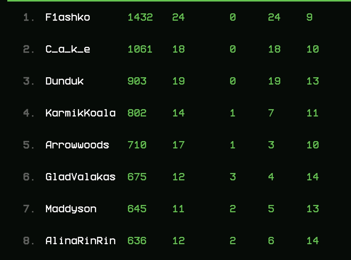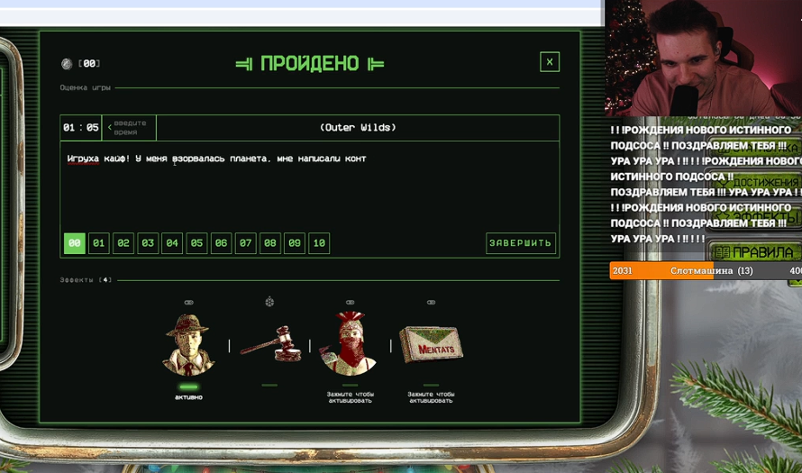 По инсайдам от кефирного голема алинарин уже НЕ успеет пройти майнкрафт. Дундук сошел с дистанции в гонке за крышками. Единственный, кто может повлиять на положение в таблице (а конкретно на положение алинырин и жопича) - флешка, спидранящий ОутерВорлдс. До конца ивента остается около 80 МИНУТ!