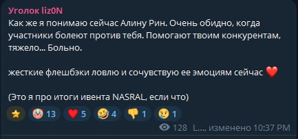Алине не хватило мужества зайти в конце ивента в общий дис. Вот этим отличаются женщины от настоящих мужчин.