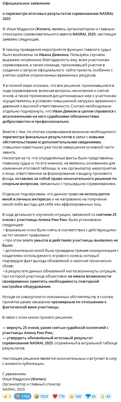 Я рада, что Илья наконец-то повёл себя не как ребёнок (как он вёл себя весь ивент), а как настоящий мужчина. Справедливость восторжествовала. Спасибо всем, кто меня поддерживал. я вам очень признательна! ⚡из тг алины рин сейчас ⚡