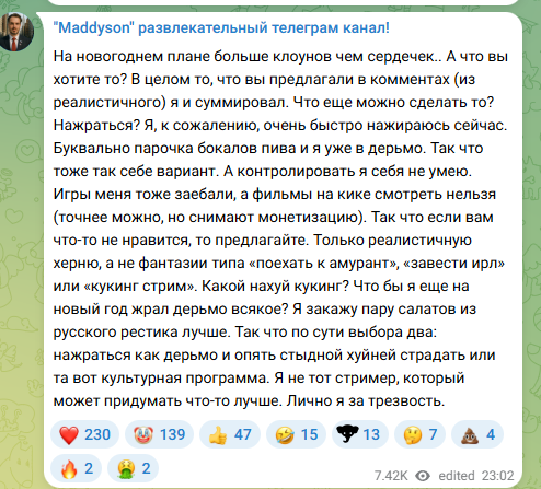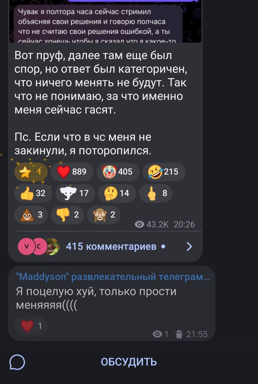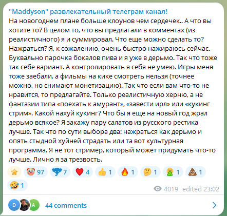 не зря я отписался от мэда тогда как знал что он опять какое-то говно устроит всё, сами этого калоеда обсуждайте похоже чел уже ничего не сможет показать интересного для меня больше нет мэдиссона