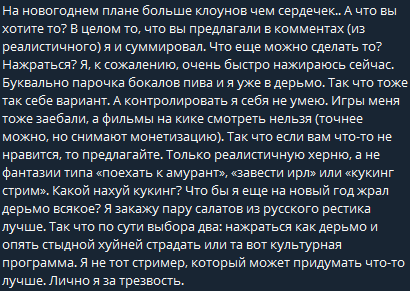 илюх, нужен подкаст под новогоднюю линейку с валакасом, потом просмотр плохого санты на гг, а там уже можно и нахуяриться как всегда под конец это лучший для тебя варик и все будут довольны после сегодняшних приколов