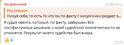 А нах нужен судья если жопич сам принимает решения по итогу. И зачем участвовать в его будущих ивентах, если он может отнять у тебя победу, проснувшись с бодуна. Весь ивен по сути нелегитимный, потому что судья в нем оказывается ничего не значил.