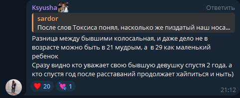 Ну малого понять можно,вам не скажется что фраза "Меня первым классом Вадим возил,понятное дело,у Токсиса денег наверн не хватило", ну пиздец же не?Вообще поебать на этого пиздюка но её слова максимально некрасивы,это ж она вроде говорила что хуесосить своего бывшего это мерзко тк по факту ты хуесосишь себя и свой выбор который когда-то сделал