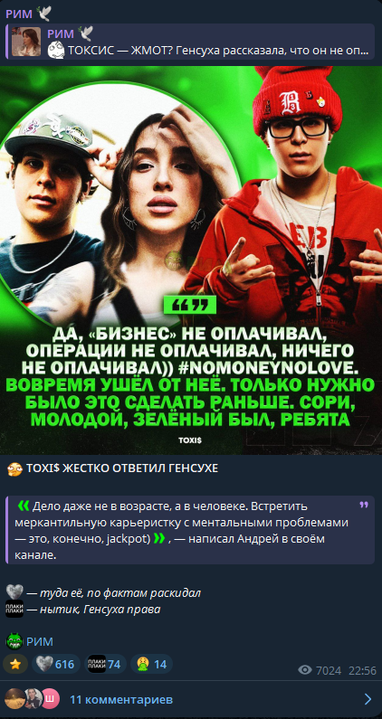 В ответ на это Токсис назвал Генсуху "меркантильной карьеристкой с ментальными проблемами":