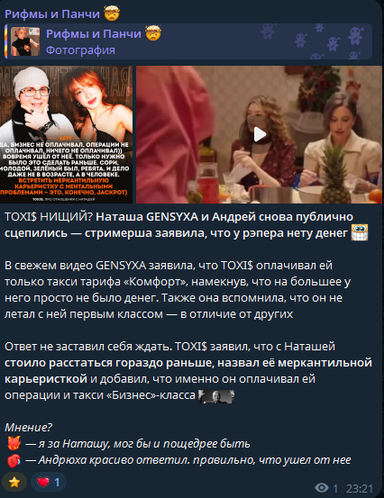 Ну я чекнул этот фрагмент, на самом деле, натаха лишнего пиздануло с этими фразочками по типу "может денег не хватило и тд", не красиво как-то, если даже это и правда, то могла бы по другому сказать
