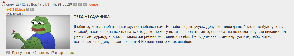 Просто представьте, чел реально сидит здесь, смотрит Мэда, видит и слышит постоянно обсуждение про марамоек, как то у одной то у другой теневые вскрываются, как их образы рушатся, слушает всю базу про женщин от Илюхи и от местных блекпильщиков. И СУКА ПРОДОЛЖАЕТ ВЕРИТЬ ЧТО У КОГО-ТО ТАМ НЕТ ТЕНЕВОГО И ЧТО ОНА НЕ ДВУЛИЧНАЯ МРАЗЬ