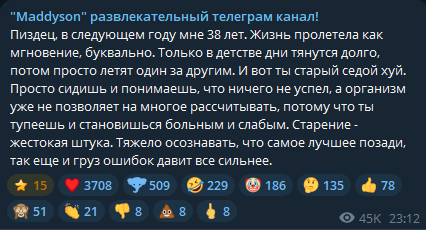 Как считаете, думает ли илюша о роскомнадзоре? Мне вот кажется да, психика убитая веществами не может справиться с кризисом среднего возраста, а это он еще на подъеме, когда спад будет может не справиться.