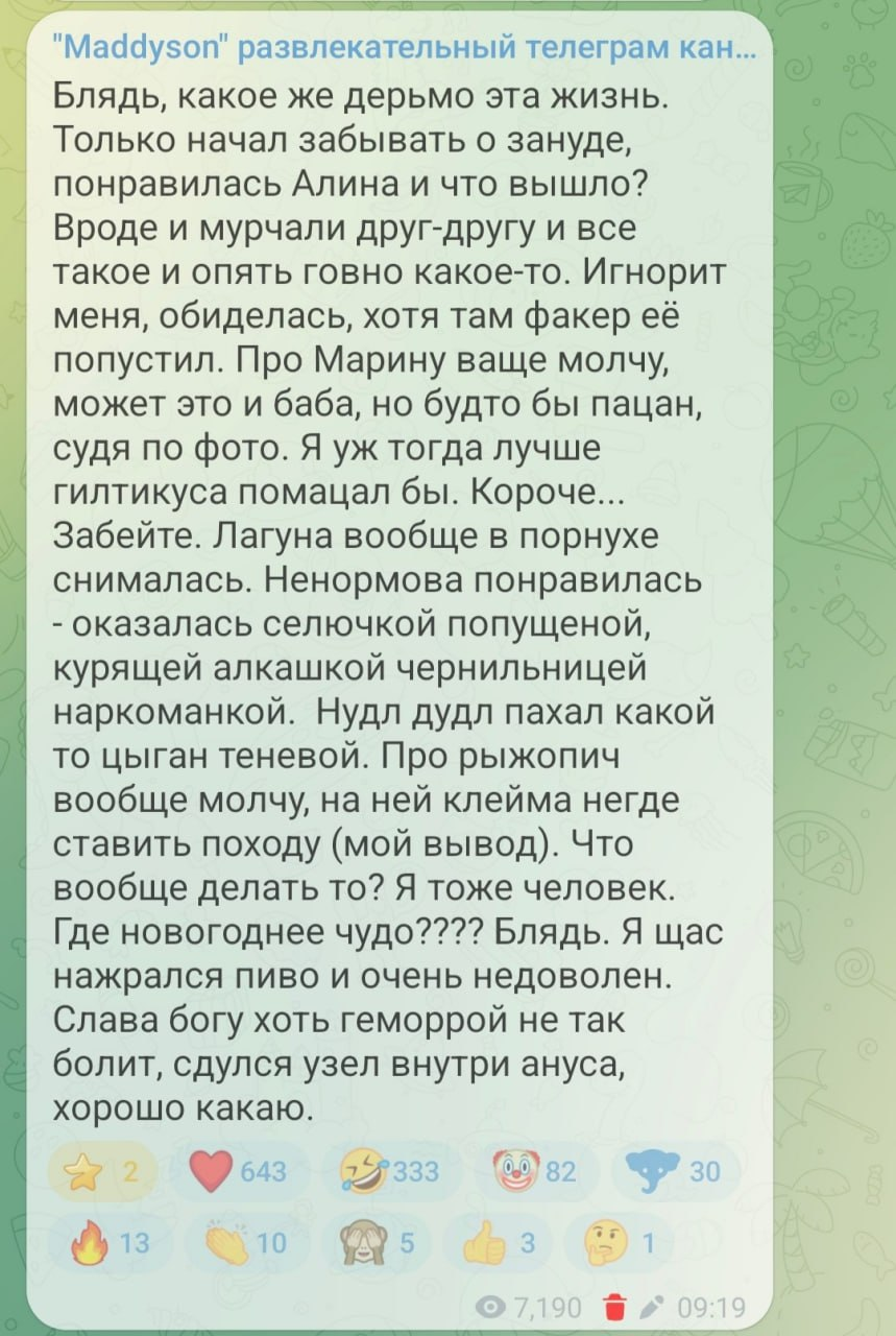 >>25916768 Ну да ты ебанутый. Натурально ебнутый. На том же вебкаме ты найдешь на любой вкус и цвет. Все что хочешь, но ты выбираешь путь война. Задонатить шлюхе и ждать похвалы как добытчик? Это даже звучит смешно. Дожили епта.
