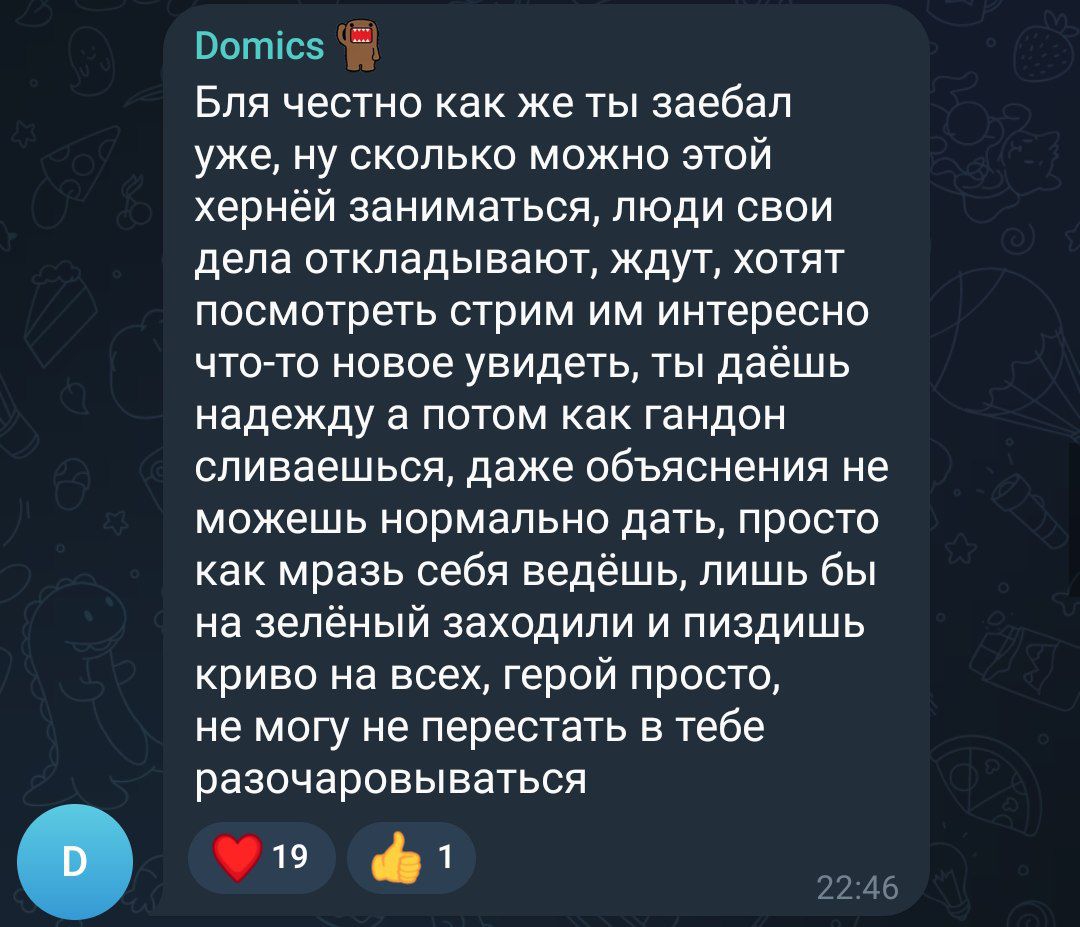 С одной стороны я понимаю поведение рыжего, ведь гайка много хуйни ему сделала и относилась к нему ни чуть не лучше, но с другой стороны я нп понимаю, почему нельзя просто дропнуть тварь, ну что в этом сложного? Зачем жить с человеком, которого ты ненавидишь? Разве это достойная жизнь? Разве так должен жить человек миллионер? Ваня, если ты тут бываешь или если тут есть твои подсосы, которые могут передать инфу, то прошу тебя, просто брось её, тебя никто не будет за это хейтить, к тебе наоборот вернуться твои чаттеры, ты сможешь порофлить над всем этим, а тебе же важен контент, так это даст море рофлов для стрима и возможность шипа с другими стримеошами. Тебе же самому лучше будет, Вань.