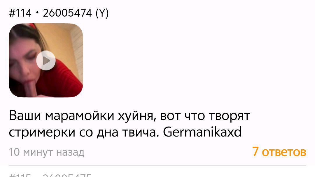 >Тебе какие ссылки нужны? Мне нужен калтент с красивой стримершей. Прекрасно понимаю, что всем похуй, особенно на дваче, че там нужно какому-то еще одному дауну с двача. Просто мольба в пустоту. Имею право.