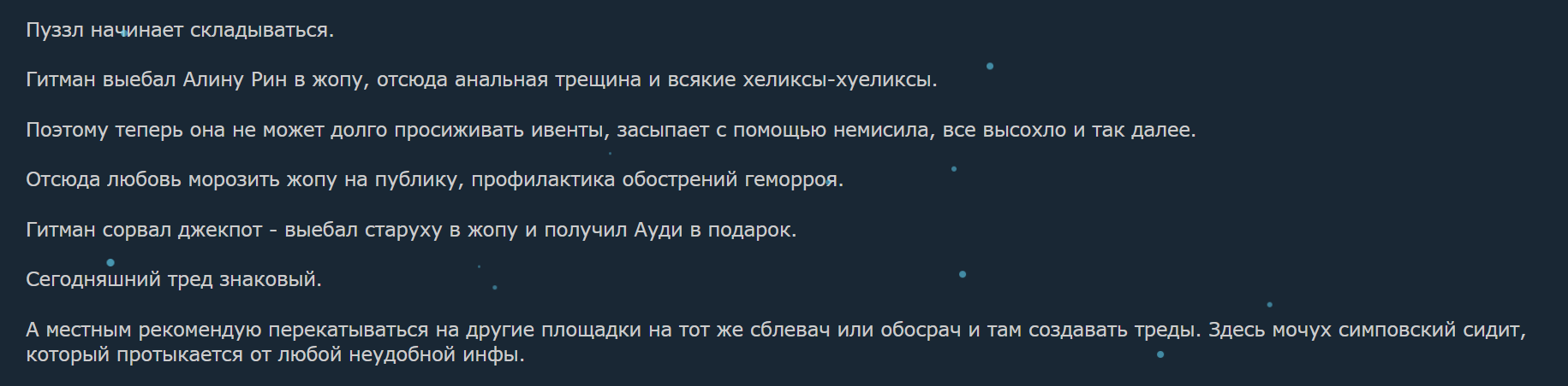 >>25953208 зайди в тред алины рин,там шизы давно эту инфу нашли,но сегодня самый полный слив был,гитман старый пучеглазый скуф ебет алину рин и делает это вероятно прямо сейчас.Но об этом никто не узнает кроме узкого круга двачеров,так как распространение этой инфы карается пермачём нахуй