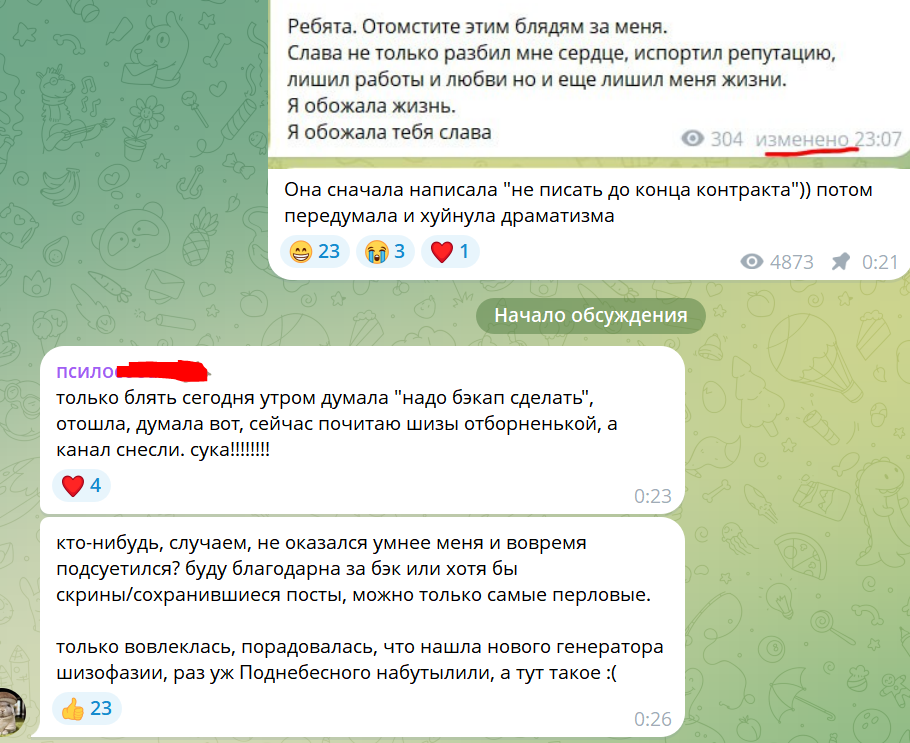 Еще раз: она выложила на продажу видео с отсосом, бусти заблокировал это через минуту, но это видео было похищено хакером и слито через год. Жопич сломал ей жизнь. Она жертва. Все из открытых источников, в основном ее интервью с дочкой кагарыча. Есть нарезки всех моментов, где она говорит, как с кайфом выкладывала в твиттер видео с зеркалом, чтобы Жопичу было стыдно и неприятно. Как хотела выложить отсос и туда, но Жопич пугнул ее родню ментами, и она залила на бусти. Как говорила «что ты мне сделаешь, я в другой стране». Где говорит как сама месяц разгоняла манию. Доставала его семью, Куромышь, и, судя по всему, делала это годами.