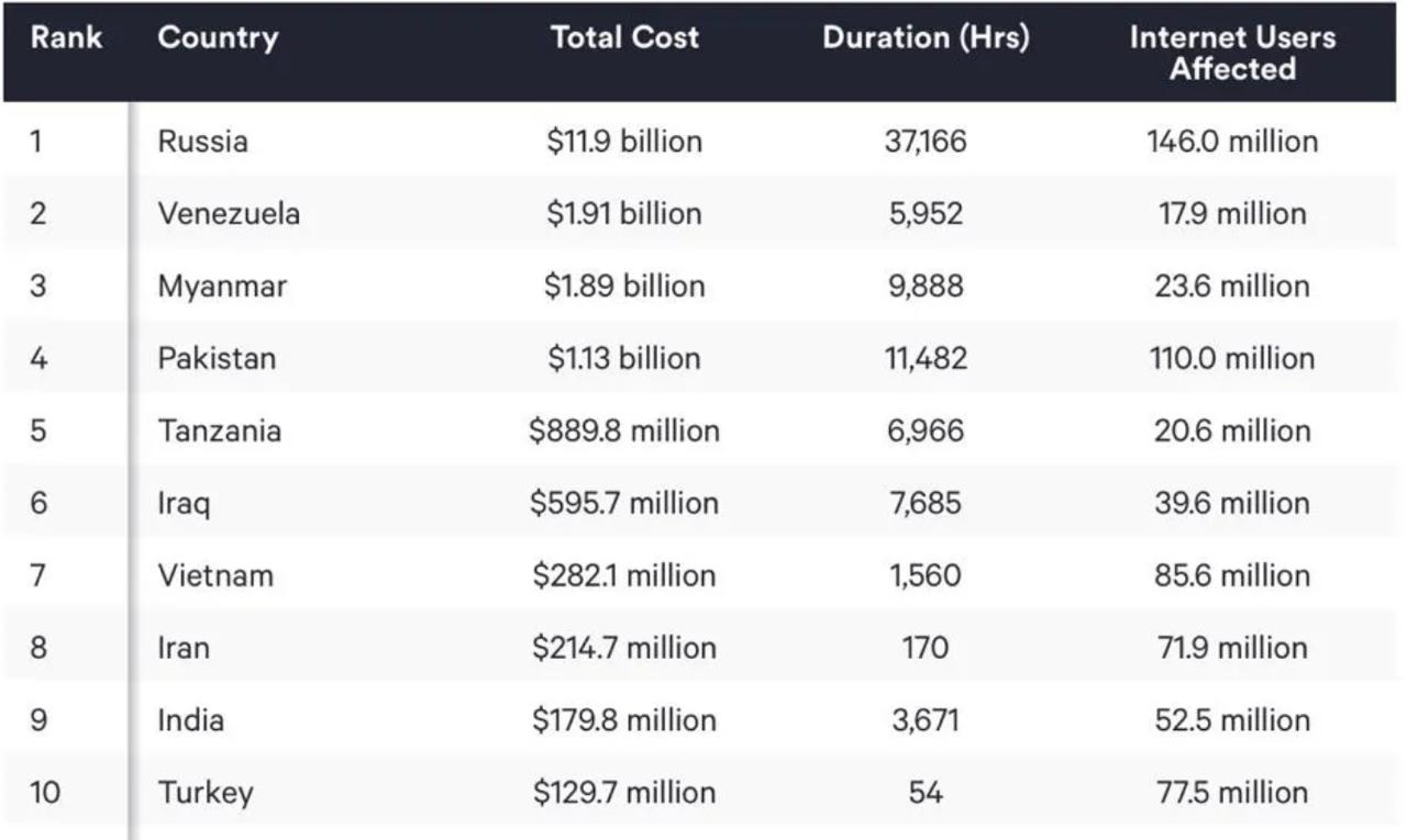 За прошлый год было зафиксировано 37 166 часов отключений интернета, которые затронули всё население страны. Экономический ущерб от этого тоже нехилый — эксперты оценили его в $11,9 миллиардов.