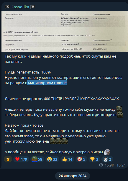 возможно гепатит у ней всегда был от матери наркоманки ,чухня его просто скрывала ,потом решила рассказать собрать жалобные донатики и оформить прикрытие для жизни с вовощем на 2 месц