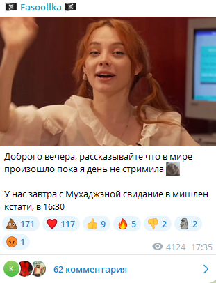 Чуханка сделала платный тг канал с записями типа чтоб по ап снова не снесли. Но это никак не поможет от нового ап. Просто послала свои принципы опять хотя кучу раз говорила что против платного тг. Сейчас есть каналы бесплатные с записями которые не сносят что ее в них не устраивает. Есть бот который все записи с ее твича в тг сохраняет. Просто решила снова переобуться и нажиться на аудитории рекламы ей уже мало.