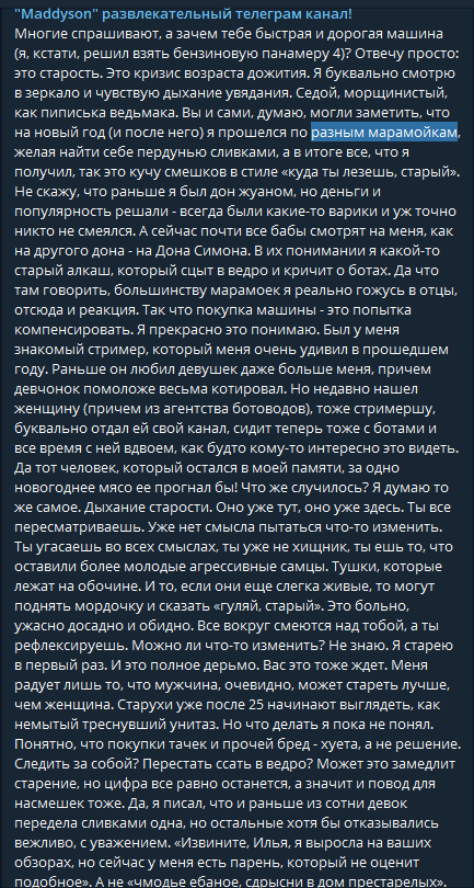 >>26045097 прям представил нахуй "а вы знаете, что она развалила такой тандем стримерский как модестал, ребята такие онлайны без накруток делали, но стоило им подселить ее, она как давай там сосать у всех мужиков на хате.." да, после такого не оправится пиздец >онлайн двачерами все двачеры, которые про нее знают, уже на канале как бы, нечего там повышать абсолютно, да и смежной аудитории у них и так навалом. у нее за 30+ скуфовики, естественно кто-то там "вырос на обзорах меда", но она старается обложиться исключительно молодыми симпами и оградиться от ебанутых стариканов, а те к ней лезут вечно с "включи трек жопича", она им подыгрывала там своими разговорами о нем иногда по типу "мэддисон да да знаю", а ща вскрылось, что для нее это какой-то по типу симонова чувак, хз чо он там делал, на твиче вроде стримил, а как будто бы и нет, потому что сасабот и коря его не знают, и они мне сказали, чтоб я больше о нем в хорошем ключе ничего не говорила и не мешала им делать деньги и строить 80тысячного популярного стримера, который уже скоро и с 100к сидеть будет на мобильной пораше рекламной