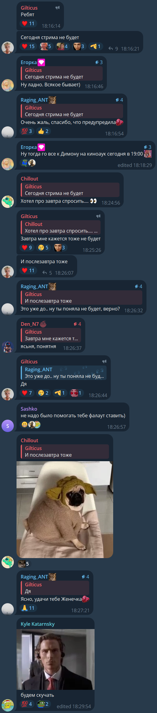 Вот поэтому нам ничего не известно, ибо любого обсуждающего кроме пуки-каки или цены на машины-квартиры на подконтрольных ресурсах сразу же повергнут обструкции. Ни Корею обговорить, ни прочие планы, ни как прошли праздники в Магнитогорске, ни ноябрьские операции, сами не спросят и вам не дадут, если пробьётесь через анальную модерацию. Атмосфера вокруг стримера абсолютно скотская, хуже только у Юзи, но это безусловно впереди ещё