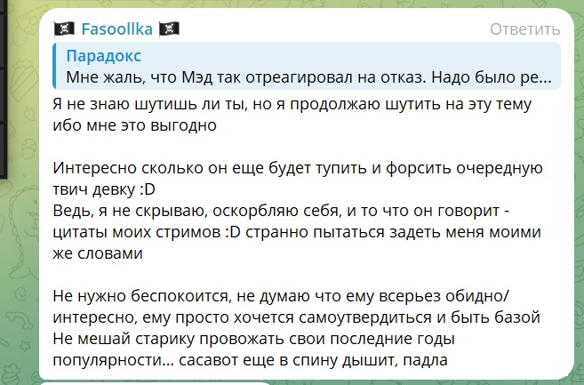 > Обсираешь всех стримерш и называешь марамойками > Подкатываешь к стримершам > Стримерши тебя публично попускают > Обижаешься на них и начинаешь плеваться желчью, раскрывать личную информацию > Говоришь аудитории, что это всё была ирония и вообще ты уже нашёл себе арийку 190см. > На самом деле живешь с Андерсоном и принимаешь от него в жопу