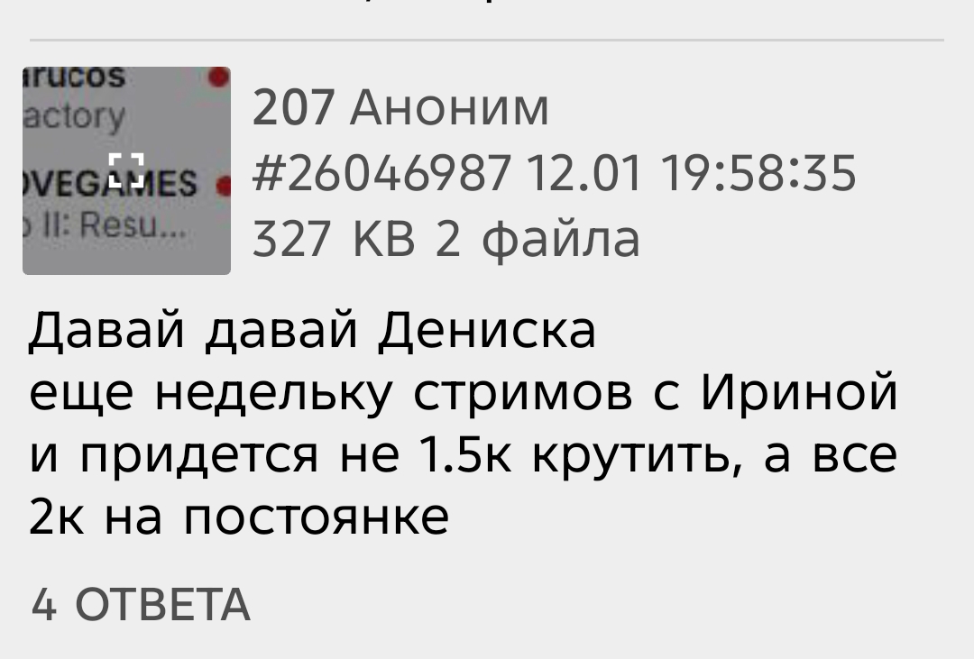 >>26048509 Потому что этот онлайн на повторах, он, блядь, чуть ли не выше, чем был до этого реальный онлайн у Дениса. То есть, ну, это просто бред, блядь. Зачем еще это может делаться? Я хз. Может, он просто не может столько стримить, как остальные миньоны. И ему надо часы просмотров так добивать. Я хуй знаю, блядь. Просто, ну, это абсурд. Это палево и бред. Но это еще не все. То есть, как бы, что я вижу вообще, заходя к нему на канал. если раньше у него были какие-то стримы, какой-то контент, то сейчас он просто, ну, я уже не знаю, уже третий месяц просто сидит с этой табулой вдвоем. Ему уже канал надо не Вилов Геймс называть, а переименовываться в Вилов Булу какую-нибудь. Потому что, ну, блядь, там больше вообще ничего не происходит. Причем я совершенно не понимаю, кому может быть интересно на это смотреть Денис импозантный мужчина, он всегда нравился женщинам И у него, кстати, я думаю, что большая довольно аудитория женская Им, бля, интересно смотреть на это Мне кажется, если поставить себя в позицию фанаток Дениса То он мне, блядь, был противный, как будто бы Типа, я не говорю, что надо скрывать свои отношения или еще что-то. Ну, ты как бы обознач бы, типа, я не говорю, что надо скрывать свои отношения или еще что-то, но ты как бы обозначил, вот у меня есть девушка красивая, все, замечательно, она прекрасная стримерша, ну и стримьте, блядь, я тоже какое-то время там жил со стримершами, Но у меня даже мыслей не было лезть к ним на канал или просто с собой сажать. Ну, там отдельные случаи были, но это какой-то бред. Постоянно. Ну, у меня даже мыслей не было лезть к ним на канал или просто с собой сажать. Ну, там отдельные случаи были, но это какой-то бред постоянно-то. То есть, ну, как бы, а смысл? Это реальный онлайн, мне кажется, просто уничтожает. Там даже с ботами уже осталось вообще всего ничего. То есть, на повторах было больше после Нового года, чем сейчас. Я уж молчу там о цифрах, которые Денис в прайме способен выбивать. Причем честных. Там от пяти до десяти тысяч. Просто сидит, блин, со своей девушкой. Тоже стримершей. Уже начинает создаваться впечатление, что это ее канал. Мне уже кажется, что она, знаете, как это... Как шпионка там, типа, от агентства GCA заслана, типа, к Вилавгеймсу, чтобы подмять его. Потому что, ну, это просто какая-то херня. Ну, типа, серьезно. Типа, я против любви отношений ничего не имею. Я уверен, что она прекрасная женщина, которая готовит замечательное мясо на Новый год, так сказать. Но, блядь, типа... имею. Я уверен, что она прекрасная женщина, которая готовит замечательное мясо на Новый год, так сказать. Но, блядь, типа, просто представьте, что я сейчас замутился в какой-нибудь стриме. Трудно это представить, конечно. Я сам, ну, типа, в шоке был бы от такого развития событий. Ну, возьмем какую-нибудь совсем уж страхоебину.ину кориум си например вот я замутил с корием си я просто блять говорю все пацаны нахуй сегодня у меня кори в гостях и мы просто сидим блять сидим целыми днями с корием си блять я вам показываю как аккорием все замечательно она со мной играет целыми днями в игры ну мы показываем наш бы так сказать потом снова играем в игры потом я говорю какая замечательная давайте к ней на канал зайдем и так и за дня в день да вы бы наверное вы бы просто ну во-первых половину бы ушло потому что на это говно невозможно смотреть половину просто не хуесосил постоянно что я 