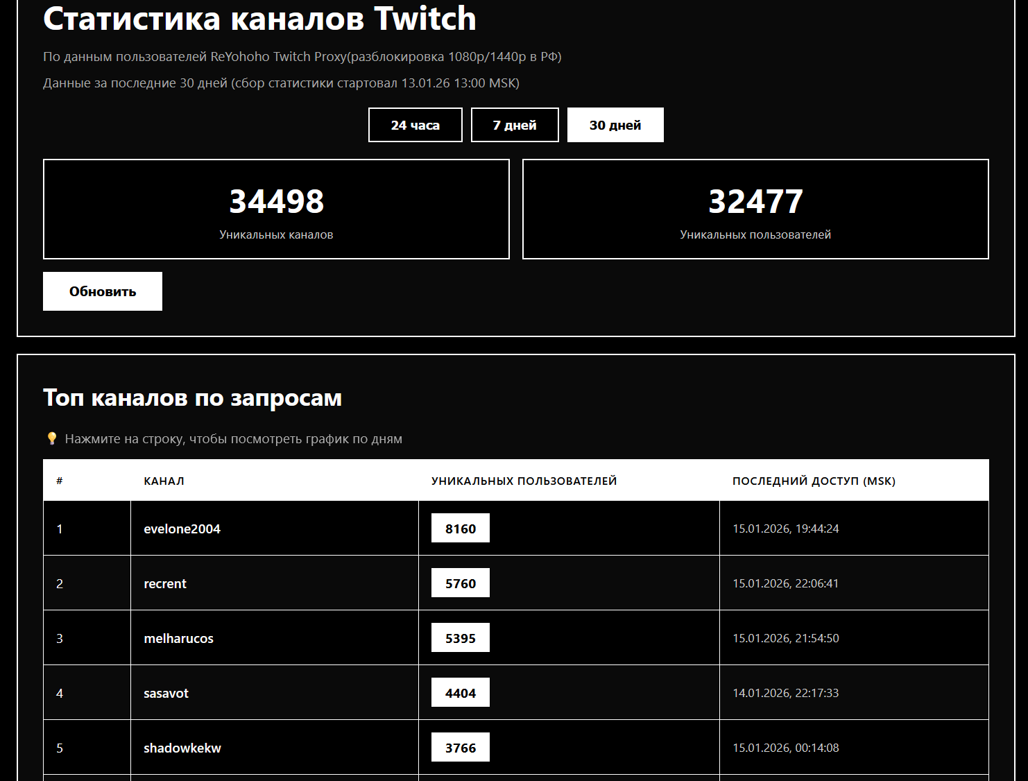 чел который делает расширение для обхода блока 1080п выпустил стату использования + какие каналы смотрят вот и можно узнать, кого реально смотрят живые зрители https://starege5.rte.net.ru/rtp-stats?period=7d