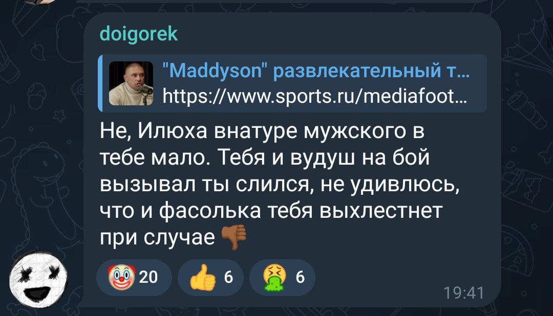 Ебать тут пидарасина сидит. Постоянно какого-то жирного мужика постит. Только вдууумайтесь. Он заходит в телеграм, скачивает ролики и приносит сюда. Это же больной психически. Ему реально нужно в дурочку на годик. То есть реально сиди пидарс, который занюхивает все ролики и фотки мужика и хранит их на компе.