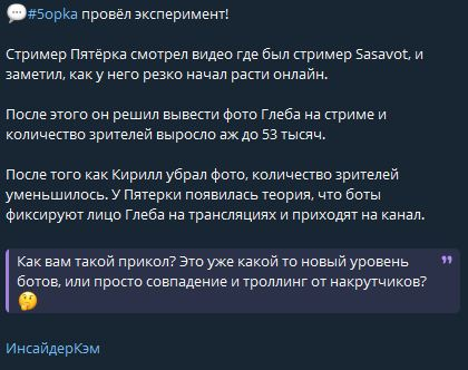 Я видел днём этот стрим пятёрки, у него онлайн и до 10к падал, потом рос до 20к, 30 я не видел у него. Странным образом работают эти боты если они отваливаются, да и его поведение было подыгрывающим ситуации. Я думаю это просто ему кто-то накрутил потому что он смотрел лучшие моменты сасавота (просто ебейший дегенеративный кал для даунов) чтобы прикольнуться.