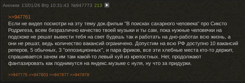 >>26095358 >Хвалят = разбирающиеся аноны, увожаемо. Я-то знаю, что они разбираются. Там полно музыкантов, работающих с лейблами и выпускающими свои релизы на носителях. Их мнение, конечно, в преоритете для меня, как опытных и проф. музмейкеров. Я хотя бы могу на практике услышать их уровень компентентности. > уж скупую гармонию и полное отсутствие мелодических голосов В этом и проблема. В твоей ненаслушанности. Ты зачем-то атмосферик драмбасс сравнивал с оперой или с фолком, еще какой-то академической музыкой, зачем? Нужно смотреть, как звучит это в рамках жанра и его особенностей. Понятное дело, музыка, базирующаяся на эмбиенте на фоне оркеста кажется примитивной и и минмалистичной, когда упор делается совсем на другие элементы, а не на мелодические голоса.