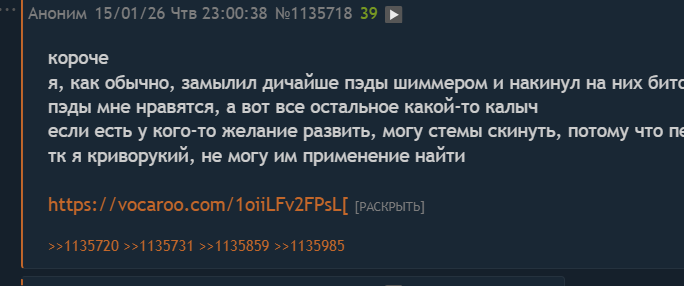 >>26095264 Понятно. Критикуют и ругают = скуфы, их мнение не имеет значения. Хвалят = разбирающиеся аноны, увожаемо. Я, кстати, микширование твоё ни разу не комментировал, т.к. сам в этом полный ноль. ЗВуки даже хвалил, помнится, а почему бы и не похвалить, если заслуженно. Ну и пожурил вполне сдержанно только слишком уж скупую гармонию и полное отсутствие мелодических голосов. За что и был записан в тупые пидарахи и снежные нигеры без культуры и совести. А на счёт того, что дескать не предлагал оценить, так это автоматически подразумевается, если что-то выкладываешь в публичный чатик. Может стоило приписочку сделать "я ранимый нарцисс, не критикуйте, озвучивайте только если понравилось!" Чес-слово, я бы в таком случае язык из жопы не доставал бы, зачем художника обижать, если он не готов.