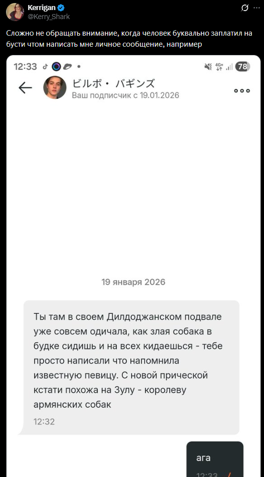 А если она что-то пишет в ответ (и это не оскорбления (по факту ее максимум это тявкать как собачке и оскорблять)) то прямо видно как она себя закапывает.