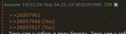 >>26097961 >>26097940 >>26097917 Тихо сам с собою я веду беседу. Тихо сам с собою я домой приеду. Выпью сам с собою за свое здоровье, Тихо сам с собою я займусь любовью.