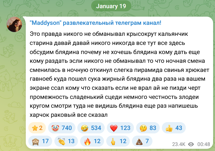 Я последний год кидаю вам трендовые шебмки, скидываю новости и прочее. И ноль отдачи. Ноль юшек. Просто ноль. Я смотрю что вы хотите оставаться тупым зашоренным быдлом, которое варится в стримерском помёте, чтож. Я вам оставлю такую возможность. Я, честно, устал. Сил мои больше нет. Прощайте, друзья!
