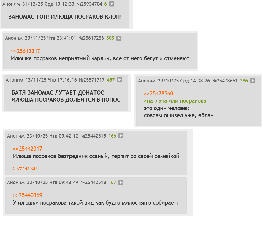 VANOMAS (он же Иван Маслаков, Посраков, Посрачков, Пасра, Бомж, Вислопис, Козёл, Козлиец, Зашуганная Крыса, Глиномес, Ванограз, Шизомас, Говномас, Маслопитек, Поллюционер) — кринжовый российский фрик нижнего интернета, стример и обзорщик видеоигр, автор геополитической аналитики, создатель философии разумизма, лицемерный одинокий шизофреник с запредельным уровнем тупизны, бреда величия, нарциссизма и злобы. Завистник, ненавидящий всех и скамящий своих донатеров, эпично проебывающий собственную жизнь в засранной нищей маслушке, за чем мы все и наблюдаем. Ничего не знает и ничего не умеет в 42 года. Родился 9 февраля 1984 года и медленно, но верно движется к полной деградации и забвению.