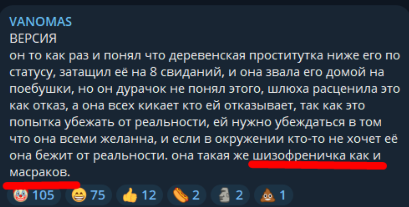 >>26107473 Вывод ошибочный, потому что ты именно коупишь, и тебе правильно указали на это. Она никогда и не симпила, по масраку, ничто на это не указывает. То что она сидела в чате когда-то и откровенно его хуисосила, а дурачок масраков в силу своего слабоумия этого не понимал, всю это постиронию многослойную, решил что она по нему симпит, как и некоторые его подсосы кстати. Она этим пользовалась и обоссывала, я когда читал её сообщения ржал как не в себя. Очень тонко его стебала несколько лет, это виртуозно! Симпит по масраку такие дурочки как его донатеры - Гамовер, Туманное Говно, Бажин, Андер и другие кто в чате ему нализывает, вот это всё симпы, которые его больше 15 лет мониторят, она пришла году в 19, поржала над дурачком, попиявилась, и больше не вспоминает о нём. И не надо мне рассказывать что она в чате 24/7 сидела, плагин для хрома есть, которые показывает фейк/не фейк, так вот не фейк можно было и без плагина задетектить, и большую часть времени в его чате именно фейки Казны и написывали.