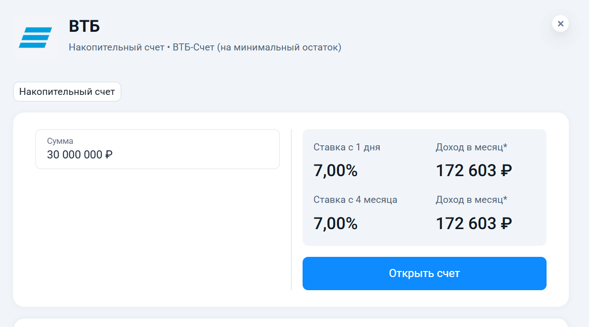 >>26111318 Сейчас в ВТБ ставка по депозитам 14.5% годовых. Накопительным счётом под 7% никто в своём уме пользоваться не будет.