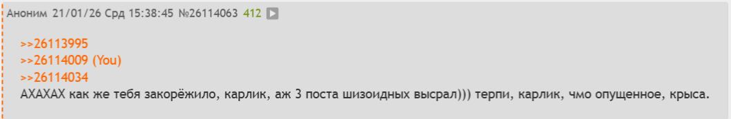 >>26114076 >буду воспринимать это как оскорбление так ты и не принял это как оскорбление, ты не сагрился, а значит признал, что ты карлик опущенный, крыса и чмошник АХАХАХАХА АРИРУУЮЮЮЮ