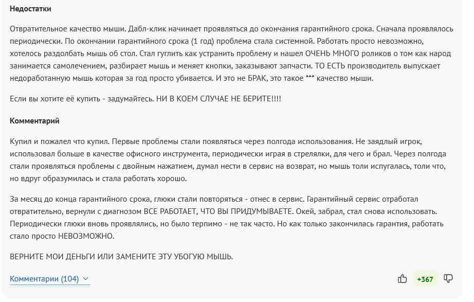 >>26104392 У меня колесико через год забилось пылью и кошачьей шерстью - пришлось разбирать. Ещё года через 2 появился даблклик. Купил микрики omron на озоне 10 штук за 50 рублей где-то и заменил сразу все