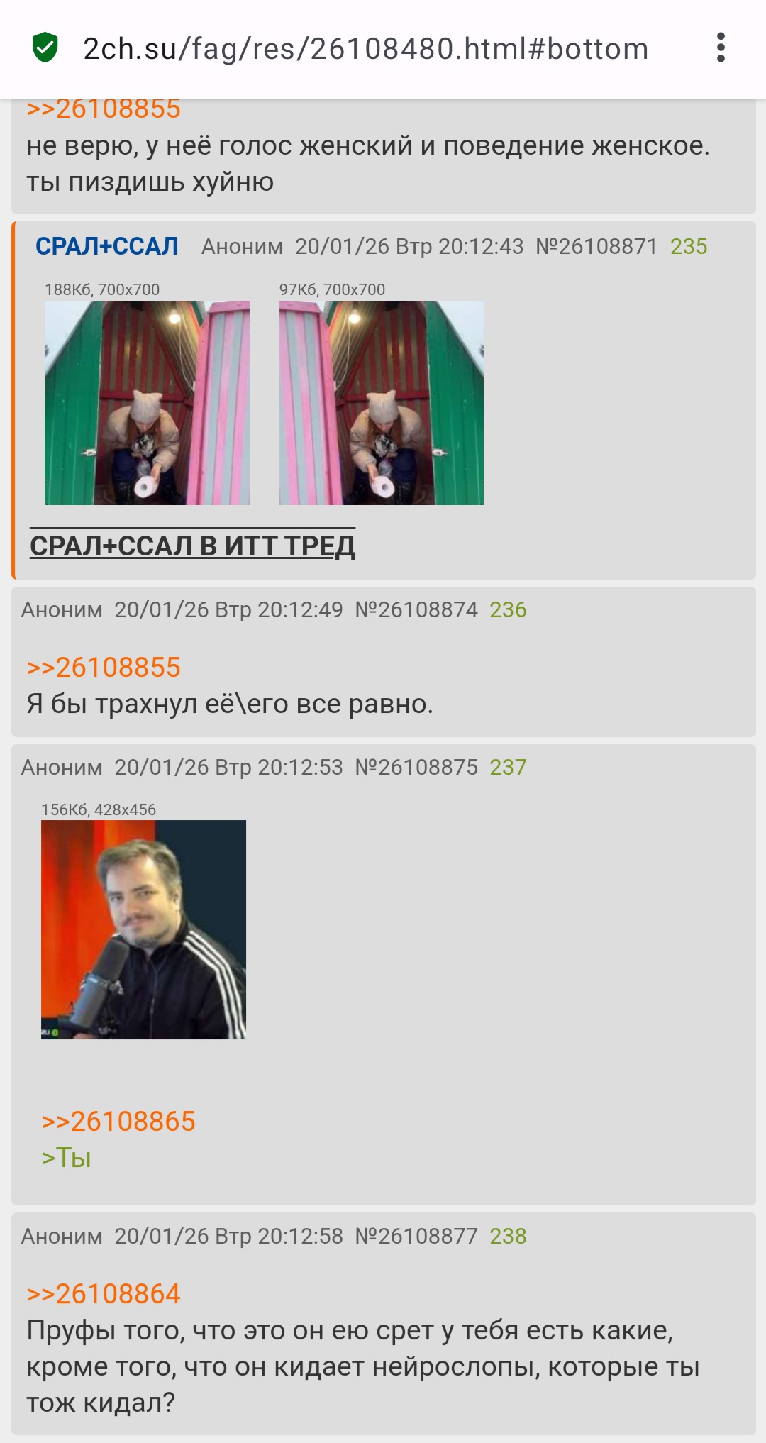 >>26116790 Юмор галядаунов. Кстати этот додик до сих пор в чате сидит, а она говорила типо не разговаривает с ним. Решил что-ли вместе с хесоямом почетное кресло куколда занять и понаблюдать за попытками следующего претендента заработать доступ в её чернилоприемник?