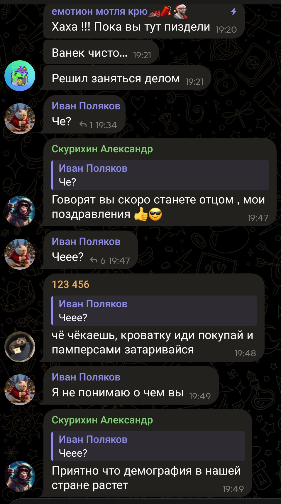 В чате ТГ походу прошла информация, что пока Галя ездила в крас, то там потрахалась с Поляковым, а теперь в админском чате призналась, что залетела, возможно поляков скоро уедет и ребенка с РСП-галей сплавят хесояму.