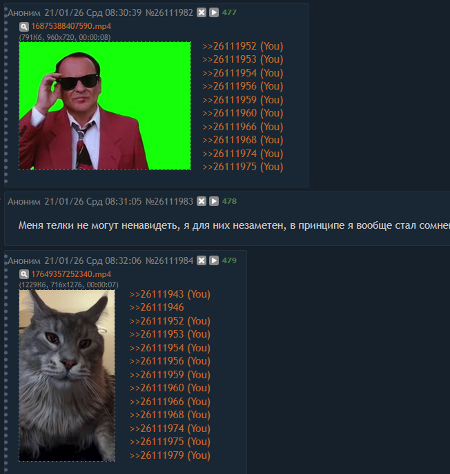 >сегодня >бля все с этого дня перестаю быть симпочмом, надо как-то кардинально показать это, таак "привет тред я ненавижу женщин", о бля заебись, братки дают юшки, симподауны и дырки рвутся с сигмы >завтра >че то както скучновато, че там на фиолетовом сайте о уля/аля/лина/рина/хуила стримит, че там эта дыромаха делает, о хихи она такая тупая не щнает что как делать, надо написать в чат, о хихи она увидела МОЁ сообщение и ОТВЕТИЛА, ладно все равно делать нехуй посижу посмотрю