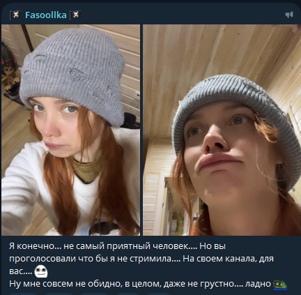 Ну F чухне. Призналась что хочет быть шлюхой, оправдывала шлюх, несла фем хуйню. Весь образ который был последние годы просто разрушился за один стрим. Жду ее осознание завтра на трезвую.